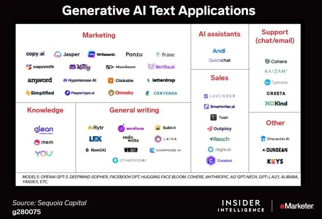 According to eMarketer, Generative AI comprised less than 1% of total US venture capital (VC) funding of $238.3 billion in 2022, according to PitchBook and the National Venture Capital Association (NVCA). An estimated 450 startups and several new funds for generative AI indicate a hot market and high hopes for growth.