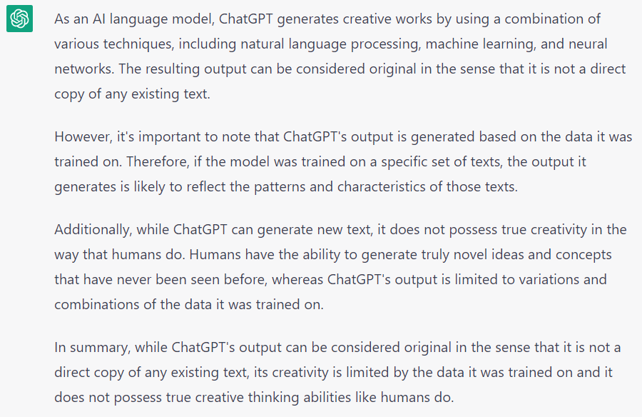 I asked ChatGPT “Is a creative work generated by chatGPT actually original and if so why?” Here is the response: